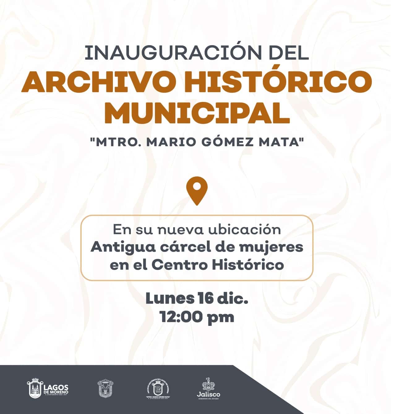 El Gobierno de Lagos de Moreno te invita a la inauguración de las nuevas instalaciones del Archivo Histórico Municipal “Mario Gómez Mata”, este lunes 16 de diciembre en punto de las 12:00 pm.