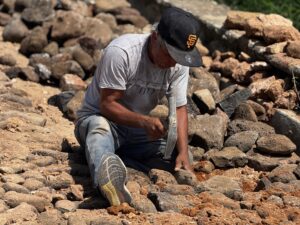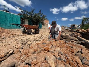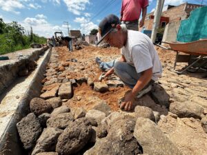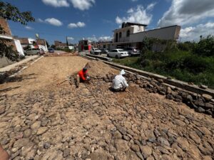 El Gobierno Municipal continúa trabajando en el fortalecimiento de la infraestructura urbana, y en esta ocasión, los esfuerzos se enfocan en la colonia Huertitas, donde avanzan los trabajos de mejoramiento vial con la construcción de pavimento con empedrado tradicional y banquetas en la calle Camino a Comanja, en el tramo comprendido desde calle Durazno hasta calle Pera.