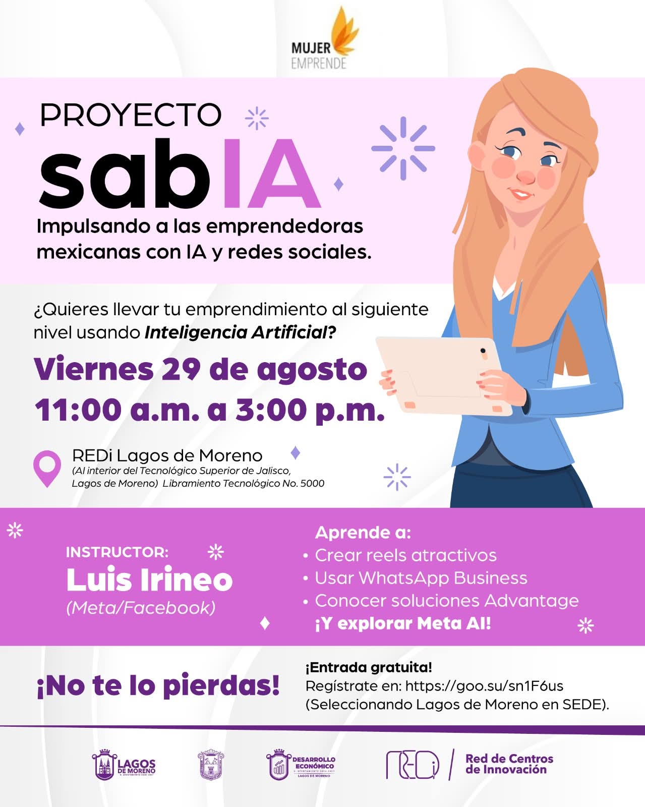 El Gobierno Municipal, a través de la Dirección de Desarrollo Económico y en coordinación con la Red de Centros de Innovación (REDi), invita a mujeres emprendedoras a participar en el proyecto sabIA, una iniciativa impulsada por META y Mujer Emprende, diseñada para impulsar el crecimiento, la innovación y la presencia digital de los negocios dirigidos por mujeres mexicanas.