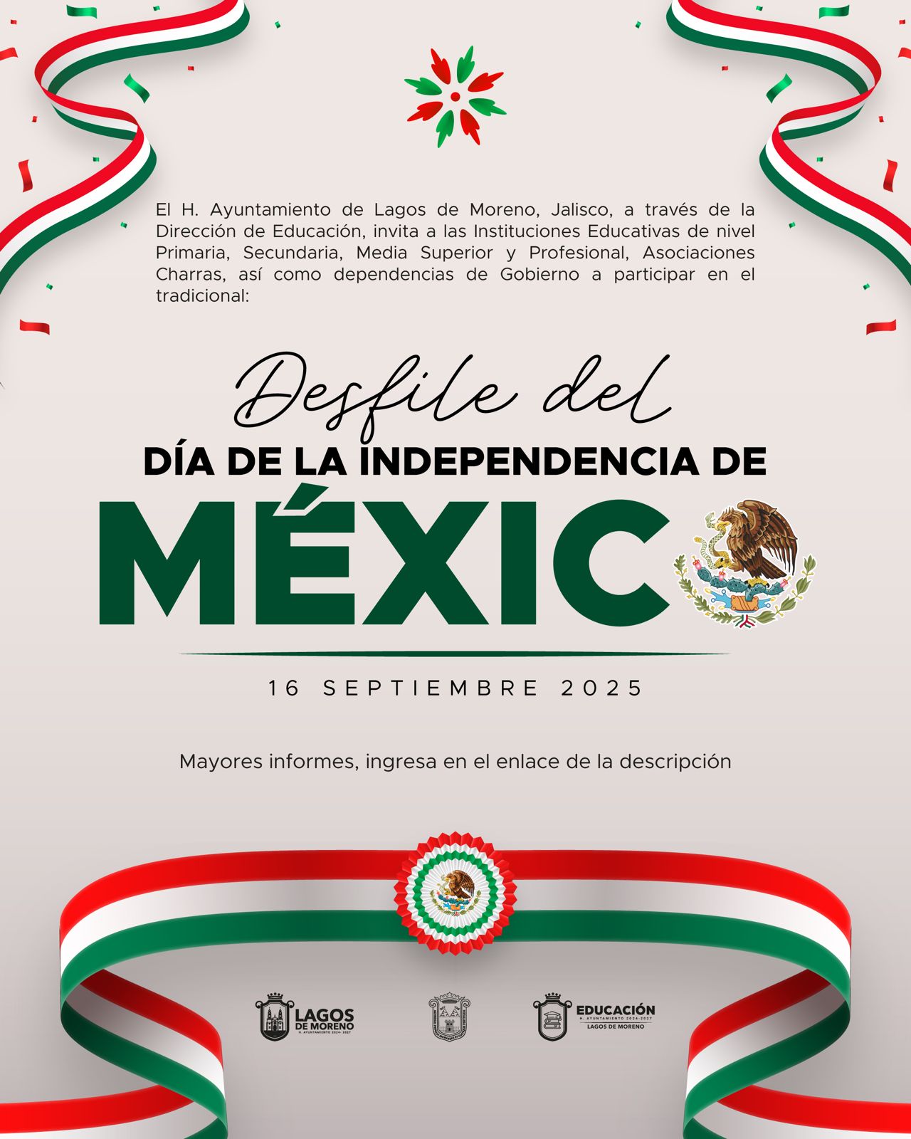 El H. Ayuntamiento de Lagos de Moreno, Jalisco, a través de la Dirección de Educación Municipal, convoca a las instituciones educativas de nivel primaria, secundaria, media superior y profesional, así como a asociaciones charras y dependencias de gobierno, a participar en el tradicional Desfile Cívico con motivo del Día de la Independencia de México.