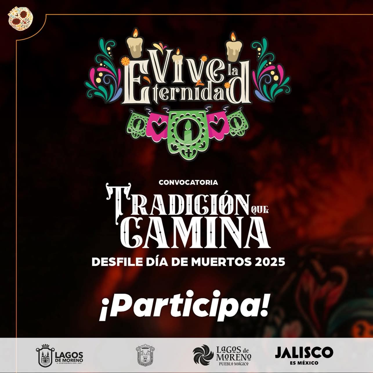 El H. Ayuntamiento de Lagos de Moreno 2024-2027, a través de la Dirección de Educación, invita cordialmente a las instituciones educativas de nivel medio superior y superior, asociaciones charras, agrupaciones culturales, así como a empresas y negocios locales, a participar en el tradicional Desfile de Día de Muertos “Tradición que Camina” – Edición 2025, una celebración que busca preservar y promover nuestras raíces y costumbres mexicanas.