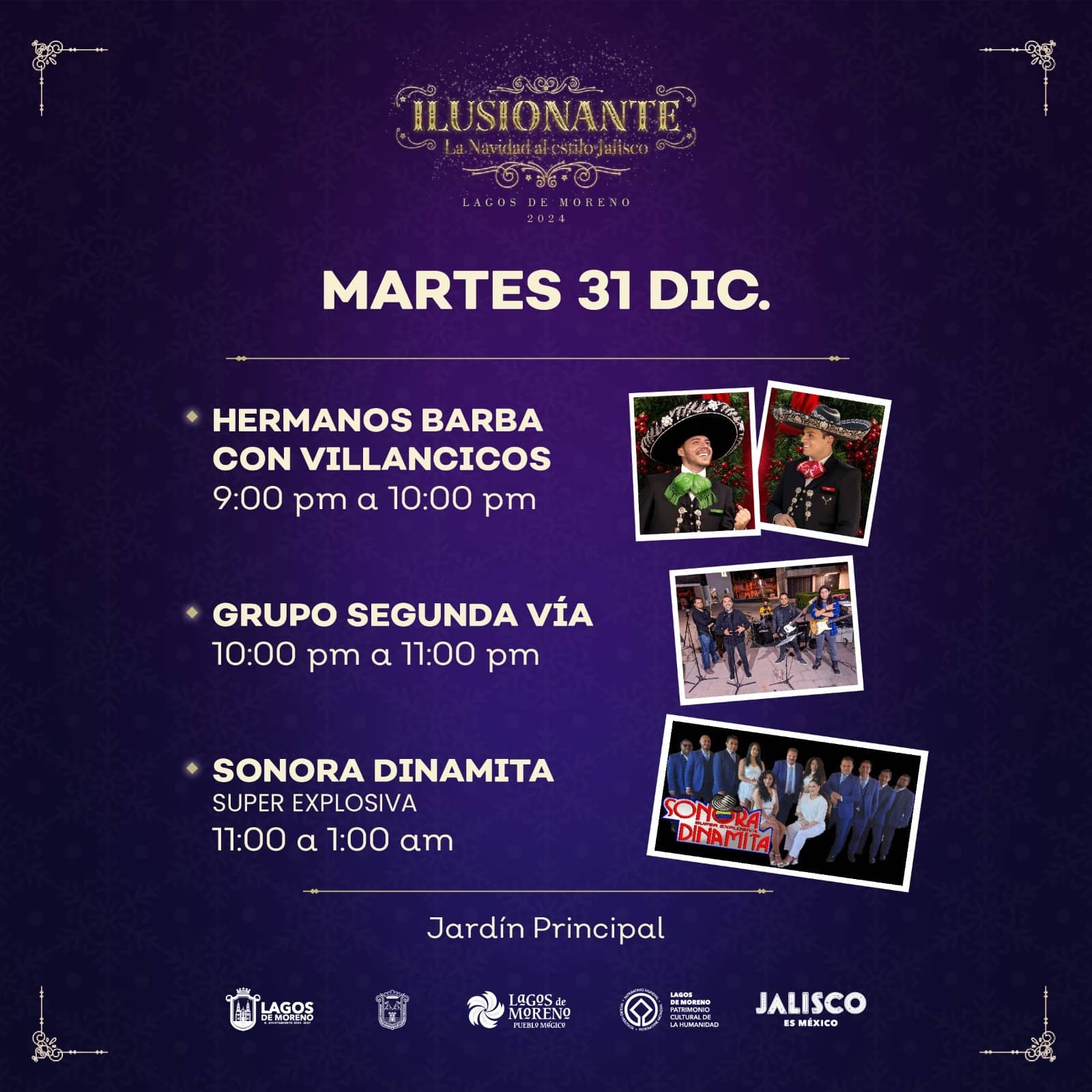 Para comenzar estos festejos, Los Hermanos Barba: Fernando y Alejandro envolverán a las y los asistentes con villancicos al estilo Jalisco, en punto de las 9:00 de la noche; enseguida, el Grupo Segunda Vía llenará de rock el primer cuadro del Centro Histórico, con la interpretación de grandes éxitos del rock clásico en inglés y español; y, por último, la Súper Explosiva Sonora Dinamita pondrá a bailar al ritmo de la cumbia al público asistente.